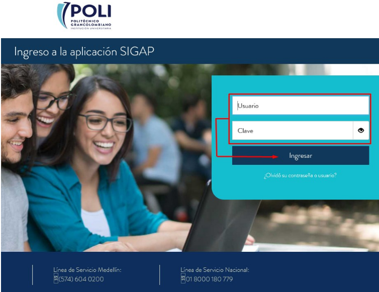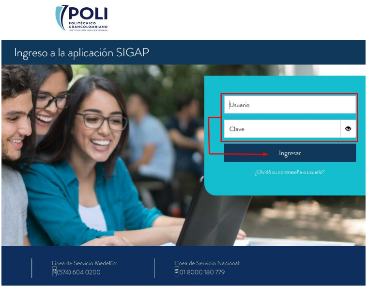 1)Entra ahora al link https://sigap.poligran.edu.co/autoservicioredireccion donde podrás ingresar con tus datos de acceso y luego haz clic en Ingresar.